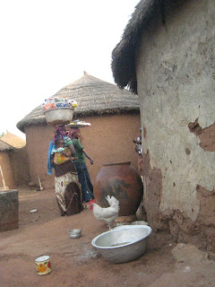 Everyday at the construction site Danielle and I received a noontime meal brought by children carried on their heads. It came in a large enameled metal pot decorated with red flowers and green leaves. It was always a rice dish, adorned with spicy tomato sauce or guinea fowl and onions. There were many spoons stuck inside and we all ate silently slurping filtered water from plastic bags ubiquitously sold at roadsides. The men plastering, or tinning the roof and mixing cement stopped and ate their lunches under trees or napped under trucks until the work hive came alive again.